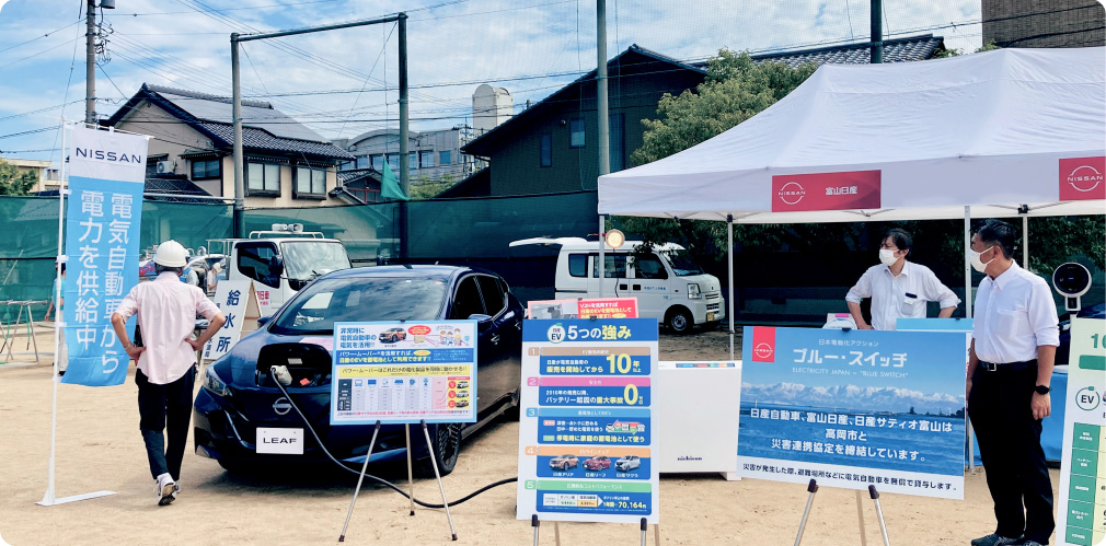 電気自動車の「電気を運べる」「電気を供給できる」機能を災害時に円滑に活用すべく、自治体と災害連携協定を締結しています。(石川県・羽咋市・小松市・かほく市・白山市・富山市・高岡市・立山町)
