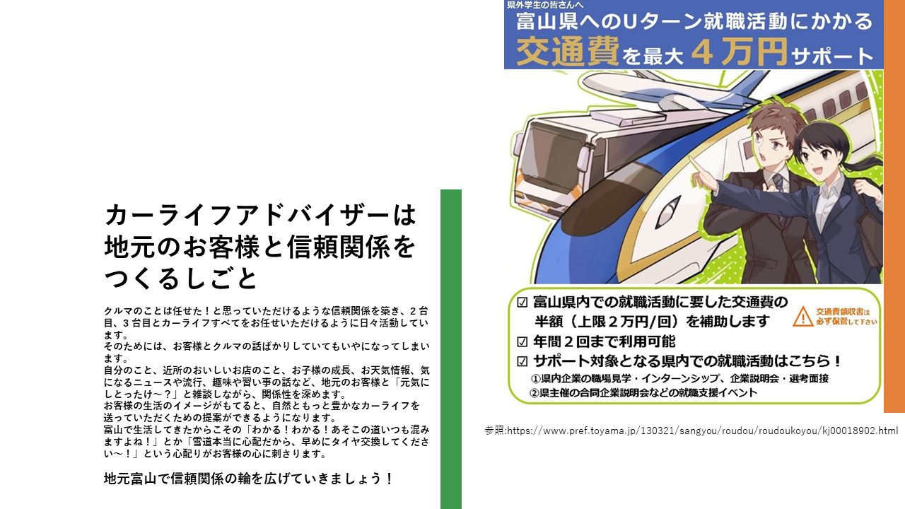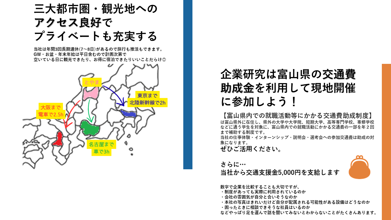 詳細:富山県庁HP内該当ページ まずはオープンカンパニーに参加してみましょう! オンライン開催でちょっと話をきいてみる【こちらをクリック】 現地開催の説明会で社風や環境も確認する【こちらをクリック】 NEXTCONTENTS JOB 仕事について ENTRY 中途採用 新卒採用