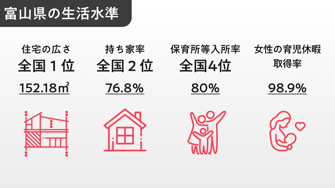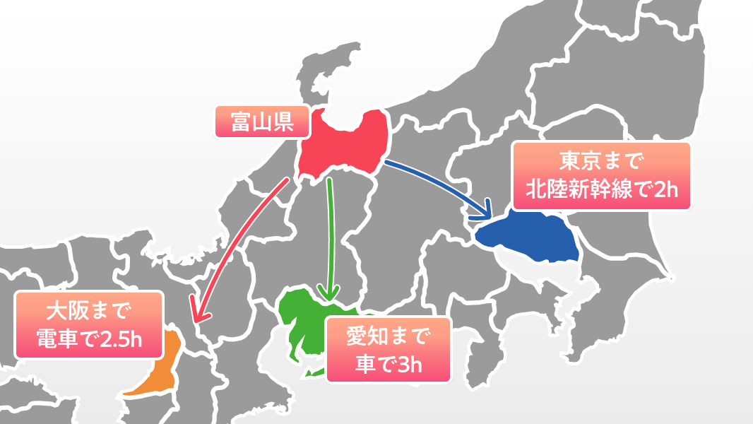 富山県はクルマでほぼ県内どこへでも約1時間。海も山も近く、通勤もレジャーも移動がスムーズなコンパクトシティ。国道8号線・41号線を中心に道路が整備されています(道路整備率は全国3位)。