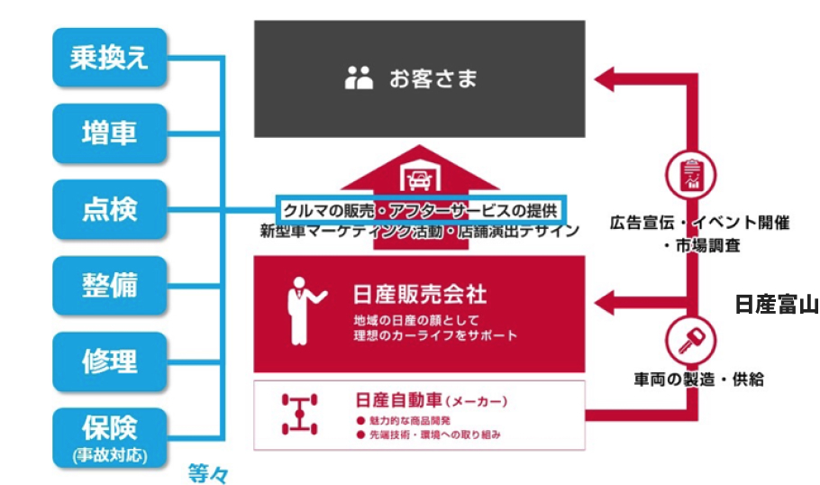 日産には電気自動車(EV)、電動車(e-POWER)、コンパクトカー、ミニバン、SUV、スポーツカー、セダン、商用車等の多彩なラインアップがそろっています。日産自動車株式会社(メーカー)が開発・生産したクルマをお客さまに販売し、保証修理を含め、様々なアフターサービスを行っています。