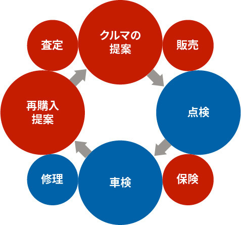 クルマのことは任せた!と思っていただけるような信頼関係を築き、2 台目、3 台目とカーライフすべてをお任せいただけるように日々活動しています。
