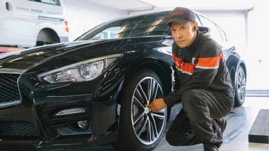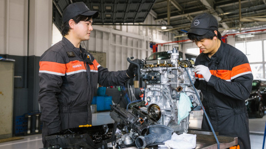 『日産サービス技術習得制度』という独自の技術力向上制度を設けています。常にお客さまに満足いただける『技術力』と『応対』を心がけ、入念に点検・整備を実施します。保安基準をクリアするだけでなく、その後のカーライフまで安全・快適であることを目指しています。